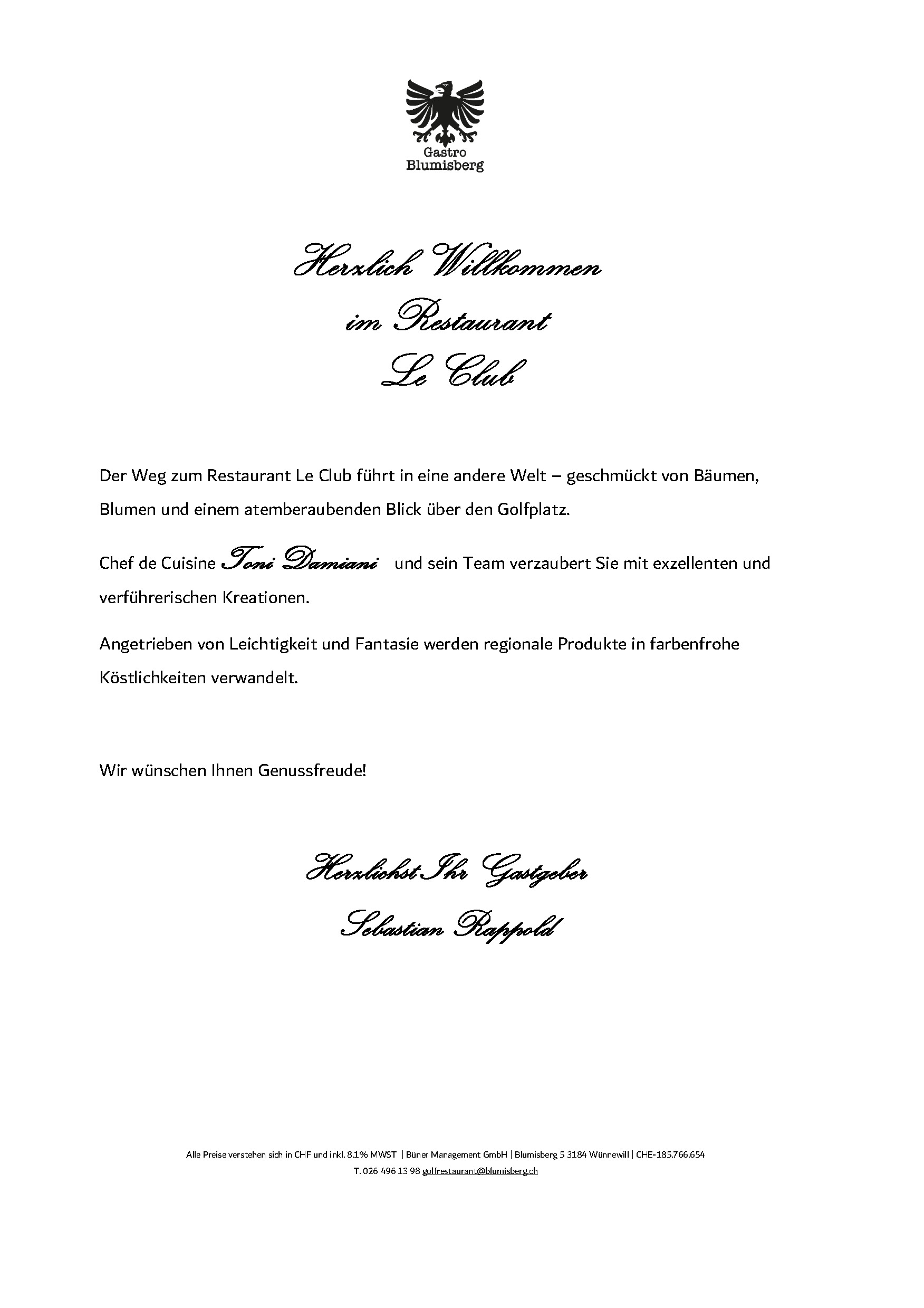 Die aktuelle Menukarte Menukarten downloaden Das Team der Büner Management GmbH mit Sebastian Rappold freut sich Sie in Blumisberg zu begrüssen. RESERVATION